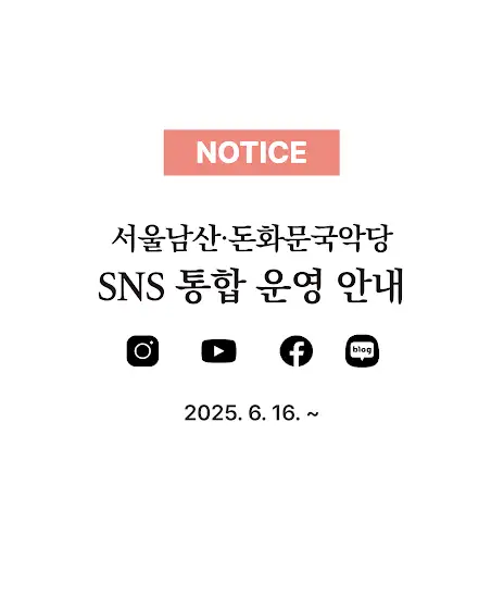 📣 𝗡𝗢𝗧𝗜𝗖𝗘 서울남산 · 돈화문국악당 SNS 통합 운영 서울남산국악당과 서울돈화문국악당의 SNS 계정이 하나로 통합 운영됩니다. 📍6월 16일 (월) : 인스타그램, 페이스북, 유튜브 📍 6월 19일 (목) : 블로그 앞으로는 두 국악당의 공연 소식과 다양한 정보들을 통합된 공식 계정을 통해 확인하실 수 있습니다. 공연 정보를 원활히 받아보시려면, 아래의 새 계정을 꼭 팔로우해주세요. ▪인스타그램 @sgtt__nd ▪페이스북 m.site.naver.com/1Kiyc ▪유튜브 m.site.naver.com/1Kiyz ▪블로그 m.site.naver.com/1KiyX 🔗 바로가기 링크는 프로필 더보기 확인해주세요. 서울남산국악당과 서울돈화문국악당은 앞으로도 더 나은 공연과 서비스를 위해 최선을 다하겠습니다. 감사합니다.