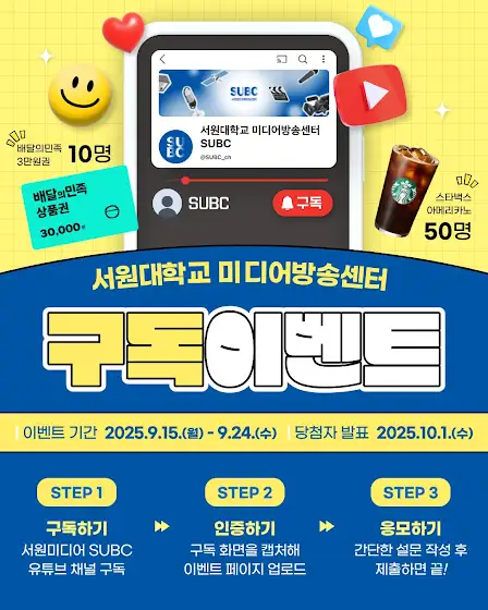 #서원대 #서원미디어방송센터 #SUBC #대학방송부 #방송부 #서원대방송부 #방송부원 #이벤트 #배달의민족 #배민 #스타벅스 #커피쿠폰 #유튜브 #구독이벤트