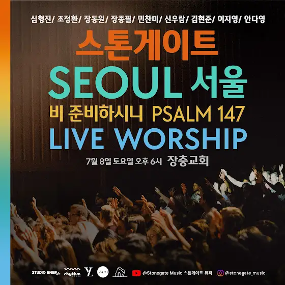 - 스톤게이트 라이브 워십집회 - 서울 장충교회 (동국대입구역3번출구) - 7월8일 토요일 저녁 6시 - 심형진, 조정환, 장동원, 장종필, 민찬미, 신우람, 김현준, 이지영, 안다영, - 비 준비하시니, 나의 하나님, 사랑이 오셨네, 은혜로다, 아름다우신, 등 다수의 곡
