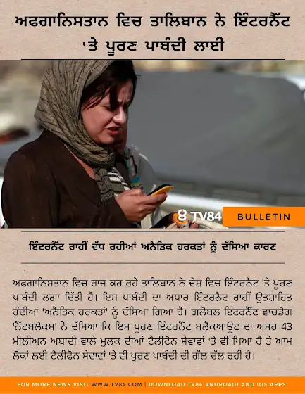 ਅਫਗਾਨਿਸਤਾਨ ਵਿਚ ਤਾਲਿਬਾਨ ਨੇ ਇੰਟਰਨੈੱਟ 'ਤੇ ਪੂਰਣ ਪਾਬੰਦੀ ਲਾਈ | ਇੰਟਰਨੈੱਟ ਰਾਹੀਂ ਵੱਧ ਰਹੀਆਂ ਅਨੈਤਿਕ ਹਰਕਤਾਂ ਨੂੰ ਦੱਸਿਆ ਕਾਰਣ