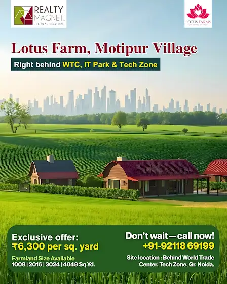 🌿 Escape the noise, invest in nature. Lotus Farm — just behind WTC, IT Park & Tech Zone, Greater Noida — brings you premium farmhouse land starting at ₹6300/sq yd. From 1008 sq yd to 1 Acre, build the life you’ve been dreaming of. 🌸✨ DM for site visit & booking details! . . . Visit realtymagnet.in/ to know more and buy now. youtube.com/@realtymagnet8277 For more details & site visit: 92118 69199‬ #Realtymagnet #LotusFarm #GreaterNoida #FarmLandForSale #DreamFarmhouse #NatureLiving #RealEstateInvestment #GreaterNoidaProperty #FarmhouseLifestyle