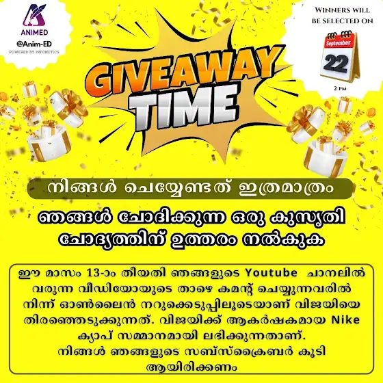 ഈ മാസം 13-ാം തീയതി 6 PM, ഞങ്ങളുടെ Youtube ചാനലിൽ വരുന്ന വീഡിയോയുടെ താഴെ കമന്റ് ചെയ്യുന്നവരിൽ നിന്ന് ഓൺലൈൻ നറുക്കെടുപ്പിലൂടെയാണ് വിജയിയെ തിരഞ്ഞെടുക്കുന്നത്. വിജയിക്ക് ആകർഷകമായ Nike ക്യാപ് സമ്മാനമായി ലഭിക്കുന്നതാണ്.