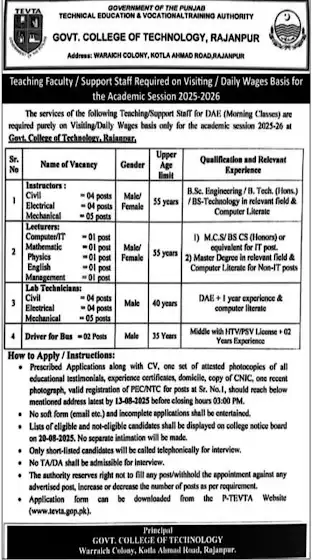 Jobs in GCT Rajanpur Last date to apply: 13th Aug, 2025 #jobs #tevta #lecturer #job