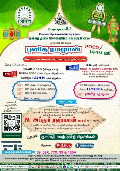 *குவைத்தில் புனித ரமழான் (2025 | 1446 ஹி) கியாமுல் லைல் சிறப்பு நிகழ்ச்சிகள்*📢 குவைத் வாழ் உறவுகளே!இன்ஷா அல்லாஹ்...📅 *20.03.2025 வியாழன் முதல் ரமழான் இறுதிவரை...* தினந்தோறும்...⏱ *நள்ளிரவு 12:45 மணி* முதல்...🕌 *K-Tic தமிழ் பள்ளிவாசல், ஹயா வ நுவைர் மஸ்ஜித்*, கத்ஆ 1, ஸ்டோர் ஏரியா, *அர்திய்யா*.(5வது ரிங் ரோடு & ஷாரா 601 வழியாக உள்ளே வர வேண்டும்)🌙 *சிறப்புத் தொழுகை*🌙 *சிறப்பு சொற்பொழிவு*🌙 *வித்ர் தொழுகை*🌙 *திக்ர் & துஆ**சிறப்புரை:*தமிழகத்திலிருந்து வருகை தந்திருக்கும் குவைத் மனிதநேய கலாச்சார பேரவையின் சிறப்பு விருந்தினர்மவ்லவீ அல்ஹாஜ் பேராசிரியர் *H. அப்துர் ரஹ்மான் பாகவீ* M.A., M.Phil., அவர்கள்,பேராசிரியர், ஜாமிஆ மிஸ்பாஹுல் ஹுதா அரபிக்கல்லூரி,நீடூர் - நெய்வாசல், மயிலாடுதுறை மாவட்டம்மற்றும் குவைத் வாழ் தமிழ் ஆலிம்கள்ஒற்றைப்படை இரவுகளில்... இரவு 12:00 மணிக்கு... 🌙 *தஸ்பீஹ் தொழுகை*மேலதிக விபரங்கள் இணைப்பில்... www.facebook.com/share/p/1EXTJm7wjB/?mibextid=oFDk…பள்ளிவாசலுக்கு வருவதற்கு... maps.app.goo.gl/yVRRv9EK6x9AMDoSAபேருந்து வழித்தடங்கள்: *59, 59X, 77X, 99 & 105A*குவைத்தில் வசிப்பவர்கள் அலைகடலென திரண்டு வருக! வெளிநாடுகளில் வசிப்போர் தங்களின் குவைத் வாழ் உறவுகளுக்கும், நட்புகளுக்கும் இச் செய்தியை எடுத்துரைத்து அவர்களையும் கலந்து கொள்ள செய்க!!🚺 பெண்களுக்கு தனியிட வசதி🅿 வாகனங்கள் நிறுத்த வசதி🍱 ஸஹர் உணவு📡 நேரலையில் காண...🎦 youtube.com/Ktic12📶 www.facebook.com/ktictraining🐤 www.twitter.com/@q8tic📞 நிகழ்ச்சிகள் குறித்து அறிய எந்நேரமும் தொடர்பு கொள்ள... +965 *9787 2482*அழைப்பில் இன்புறும்....☪ *குவைத் தமிழ் இஸ்லாமியச் சங்கம் (K-Tic)*📱+965 *9787 2482*