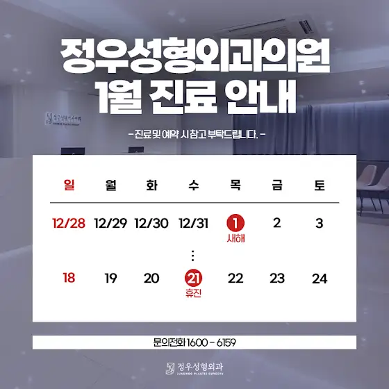 안녕하세요 정우성형외과 입니다.2026년 1월 진료 안내드립니다.* 1월 1일 (목) 새해* 1월 21일 (수) 휴진진료 일정 미리 확인하시어 예약 및 내원에 착오 없으시길 바랍니다.카톡상담 : 정우성형외과대표전화 : 1600-6159