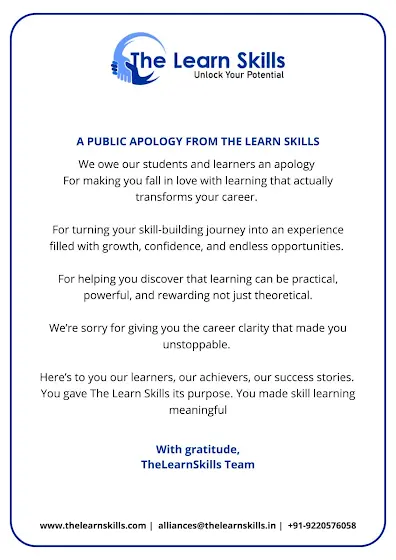 At The Learn Skills, our learners are our purpose.This apology is our gratitude — for trusting us, growing with us, and turning learning into success. 💙🌐 www.thelearnskills.com📩 alliances@thelearnskills.in📞 +91-9220576058#TheLearnSkills #TLSJourney #UpskillIndia #SuccessStories #SkillIndia #CareerTransformation #EducationForAll #StudentGrowth #ProfessionalTraining