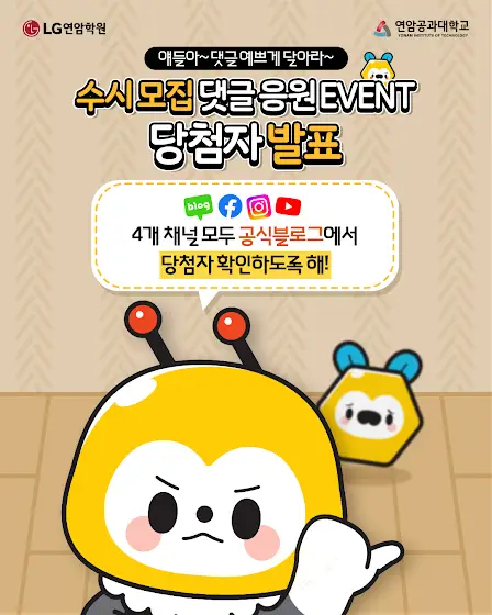 📢수시모집 댓글 응원 EVENT 당첨자 발표 4개 채널 모두 공식 블로그에서 당첨자를 확인하세요:) 당첨 여부 확인 후, 10/9(목) 23:59까지 정해진 방법으로 상품 받으실 정보를 전달해주세요.[당첨자 확인하기] 👉 blog.naver.com/yonam_public참여해주신 모든 분들께 감사드리며, 당첨되신 분들 축하드립니다🎉※개인정보 오기재 및 기한 내 무응답 시 경품 발송이 불가합니다. ※수집된 개인정보는 해당 이벤트 상품 증정을 위한 목적으로만 이용됩니다. ※부정한 방법으로 응모한 사실이 있는 경우, 당첨 이후에도 당첨이 취소될 수 있음을 주의 바랍니다.