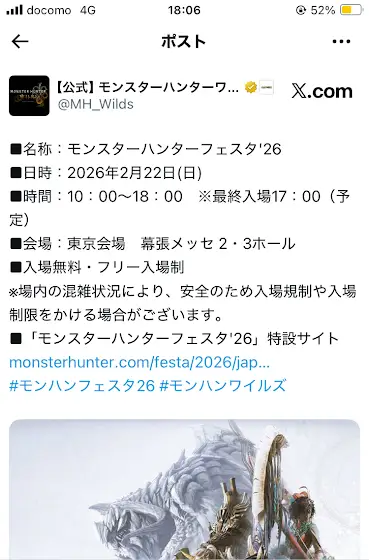 モンハンフェスタ6年ぶりの開催だ!!!楽しみすぎる!!!ゲームショウでモンハンアウトランダー試遊したが”神ゲー”確定だった。爽快感がえぐい!