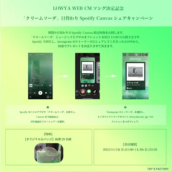 ¦NEWS¦🎧Spotify「#クリームソーダ」LOWYA WEB CMソング決定記念Spotify Canvas シェアキャンペーン スタート!期間中、Spotify Canvasにて日替わりで「クリームソーダ」MVオフショットを公開🥤※毎日12時頃更新実施期間:11月24日(月)21:00〜11月30日(日)23:59参加いただいた方の中から抽選で20名様に【オリジナル缶バッジ】をプレゼント🎁▼ 詳細はこちら☑️oisiclemelonpan.com/news/3728