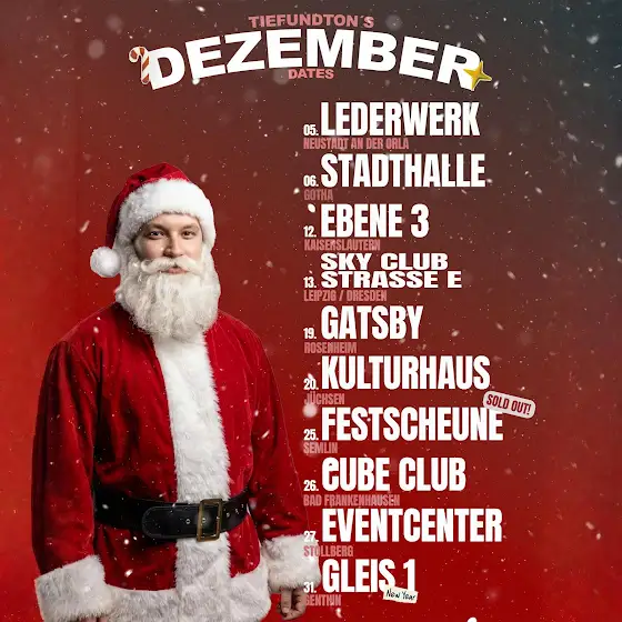 Dieses Jahr verteile ich mal die Geschenke ππDEZEMBER TOUR‡οΈβ€΄οΈ05.12. β Lederwerkπ Neustadt an der Orla06.12. β Stadthalleπ Gotha12.12. β Ebene 3π Kaiserslautern13.12. β Sky Club / Strasse Eπ Leipzig / Dresden19.12. β Gatsbyπ Rosenheim20.12. β Kulturhausπ JΓΌchsen25.12. β Festscheune (SOLD OUT)π Semlin26.12. β Cube Clubπ Bad Frankenhausen27.12. β Eventcenterπ Stollberg31.12. β Gleis 1 (New Year)π GenthinWo sehen wir uns?π