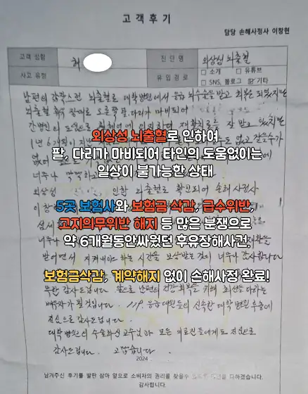 안녕하세요 이창현 손해사정사입니다. 이번사건은 외상성뇌출혈로 인하여 팔, 다리가 마비되어 타인 없이는 일상생활이 불가능한 상태인 의뢰인 이였습니다. 후유장해 보험금 분쟁으로 약 6개월간 사투를 벌인 후유장해 사건입니다. 고지의무위반, 직업급수위반, 보험금 삭감 등 수많은 분쟁이 있었던 사건이였습니다. 손해사정업을 하면서 최고 난이도 사건이였다고 해도 과언이 아니였습니다.좋은결과로 보험금삭감, 계약해지없이 후유장해보험금 손해사정 완료:)