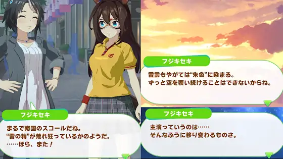https://youtu.be/XQNQVQABedUコパノリッキーの隠しイベントでの細かいネタ。コメントで教えていただきました。あざます!導入で雷雨の中フジキセキとエルコンドルパサー登場雷にビビるエルの後、雨が上がって夕焼けが広がるという内容フジキセキ産駒のカネヒキリ:ハワイ語で「雷の精」、会話でも強調されているエルコンドルパサー産駒のヴァーミリアン:こちらも会話で「朱色」が強調されてるどちらもダート名馬でコパノリッキーの前にJRA賞最優秀ダートホースを受賞しています。なので主役は次の世代に移り変わる~とフジが語ってるわけですね。ヒントというかそのまま答えの強調に気づきませんでしたへっぽこ。