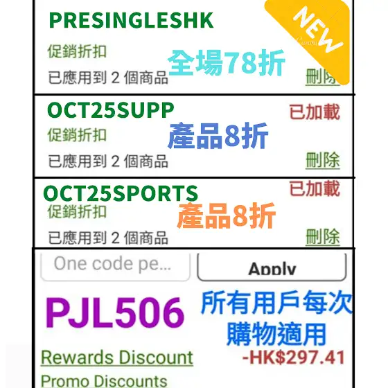 🆕️1."PRESINGLESHK"購物有78折,優惠至11月1日1am