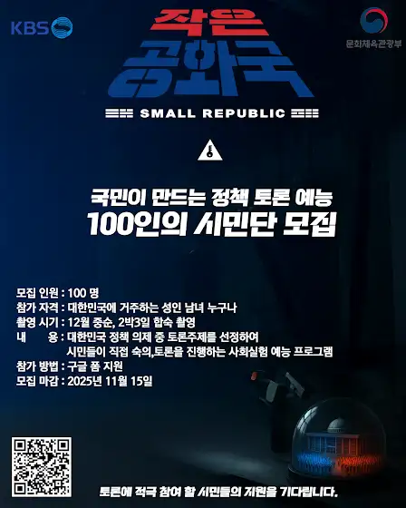 '토론 예능' 에 참여할 시민 분들을 모십니다!📋 국정 과제 토론 예능 100인의 시민단 모집📺 참여 URL : (프로필 링크 참고)🔊 토론에 적극 참여 할 시민의 지원을 기다립니다.📌모집 인원 : 100 명📌참가 자격 : 대한민국 성인 남녀노소 누구나📌촬영 시기 : 12월 중순, 2박3일 합숙📌촬영 내용"대한민국 주요 정책 의제 중 토론주제를 선정하여 시민들이 직접숙의, 토론을 진행하는 사회 실험 예능 프로그램"📌모집 마감 : 2025년 11월 15일