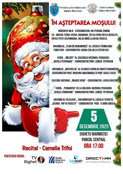 Primăria municipiului Sighetu Marmației invită toți copiii, părinții și locuitorii orașului la evenimentul „În așteptarea Moșului”, care va avea loc vineri, 5 decembrie 2025, începând cu ora 17:00, în Parcul Central. Magia sărbătorilor se aprinde la Sighet odată cu sosirea mult așteptatului Moș Nicolae, care va aduce bucurie, lumină și zâmbete celor mici. Seara va fi îmbogățită de un spectacol pregătit cu emoție și talent de copii de la Grădinița nr.8 și elevii liceelor din oraș, care vor urca pe scenă cu colinde și momente artistice pline de emoție dedicate sărbătorilor de iarnă. Evenimentul se va încheia într-o atmosferă caldă, printr-un recital special susținut de artista Camelia Trifoi, oferind un final plin de armonie acestei seri magice. Vă așteptăm cu drag să ne bucurăm împreună de frumusețea sărbătorilor, de luminile iernii și de magia întâlnirii cu Moșul!