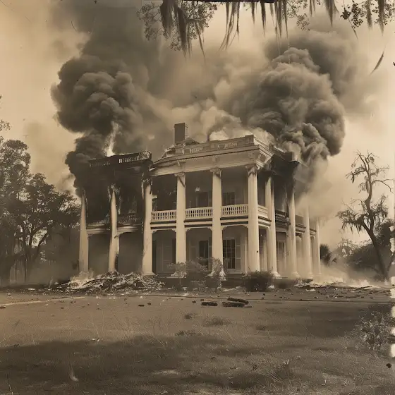 This reportedly rarely-seen private photo was taken as a plantation home burned as General Sherman's Army marched through South Georgia near Savannah, GA. Read more about The Hard Hand of War: Union Military Policy Toward Southern Civilians amzn.to/3TtuJGE