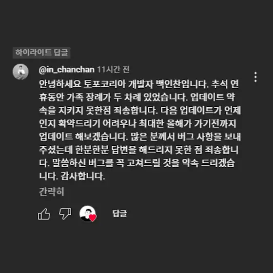업데이트 약속을 지키지 못한 점에 대해