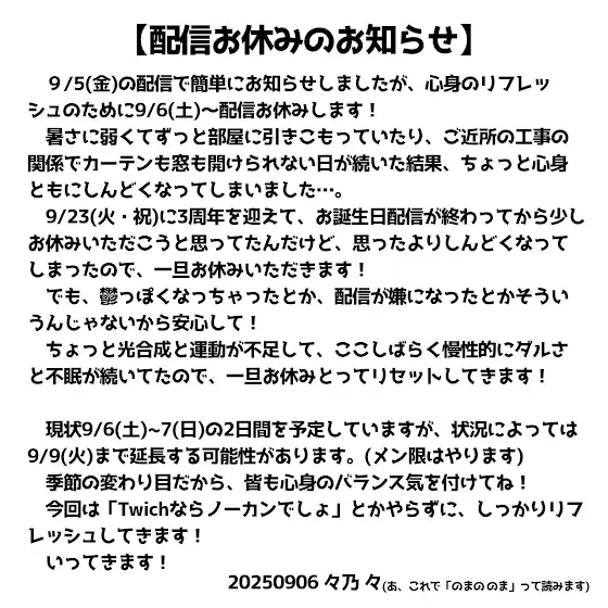 【配信お休みのお知らせ】 急なお知らせになってしまって申し訳ないけど、ちょこっとお休みをいただきます! 遅めの夏休みくらいの気持ちなので、ご心配なさらず! んじゃ、いってきます! (こちらは予約投稿なので、現在は徘徊中です)