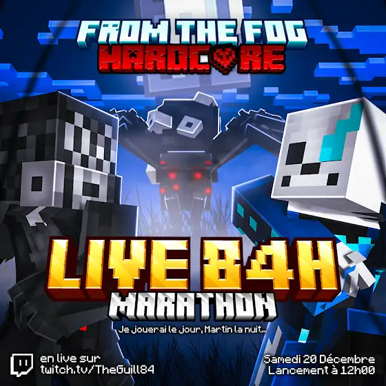 Le principe : 1 seule vie (mort définitive) sur un modpack Minecraft horreur. 84 heures pour essayer de battre le dragon ou d'autres objectifs qu'on va se fixer. Je jouerai le jour, Ponk prendra le relai la nuit et ainsi il n'y aura JAMAIS de coupure de live du samedi midi au mardi soir !