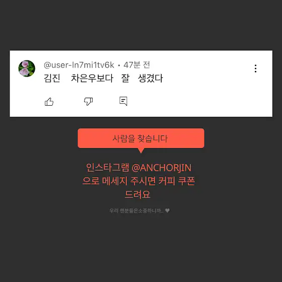 사람을 찾습니다!오늘 아침 김진의 더라방에 이 댓글 달아주신 분ㅋㅋㅋㅋㅋㅋㅋㅋㅋㅋㅋ 제가 커피 쿠폰 쏩니다DM 주세요!Tmi. 김진 앵커 댓글 하나 하나 다 봄