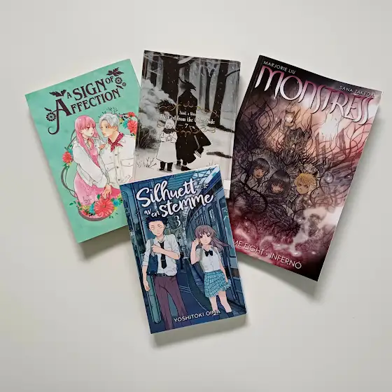 Hello, Friends! 🙋🏻‍♀️Manga this month! My manga reading was a bit less than usual. I was still able to borrow some volumes of series I've been reading for months, while others I wasn't able to get in time to read in November. Anyway...the goodies! Volume 6 of A Sign of Affection by suu Morishita—I love this sweet romance series with deaf/deafness representation done so well! * Then there was volume 8 of Monstress: Inferno—another compelling issue of this dark fantasy series. * A great surprise was finally getting a hold of volume 7 of The Girl from the Other Side—I really enjoy this kind of spooky series and had started reading it in e-book format, but got stuck at volume 6... So, very happy the library system now has this manga series too. * And I read volume 3 of A Silent Voice (in Norwegian translation: Silhuett av en stemme), a very sweet story about a deaf girl bullied at school, but the bully regrets his actions, changes his heart, and seeks to be her friend! 📖 Today I will be sharing my usual monthly reading wrap-up on the channel. I would love to hear about some special books you read this month! Happy Day 🩷