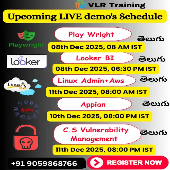 *Register Now For Live Online Demo in (IST) In Telugu*🚀 *Playwright* 08th Dec2025, 08:15 AM IST www.vlrt.in/3r----------------------------🚀 *Looker Bi* 08th Dec2025, 06:30 PM IST www.vlrt.in/lr----------------------------🚀 *Appian* 10th Dec 2025, 08:00 PM IST www.vlrt.in/5r-----------------------------🚀 *Vulnerability Management* 10h Dec,08AM www.vlrt.in/cr-----------------------------🚀 *Linux Admin with AWS* 11th Dec, 08AM www.vlrt.in/ur🤝 *Kindly Refer Your Friends*-----------------------------*Reply "STOP" For No Message*