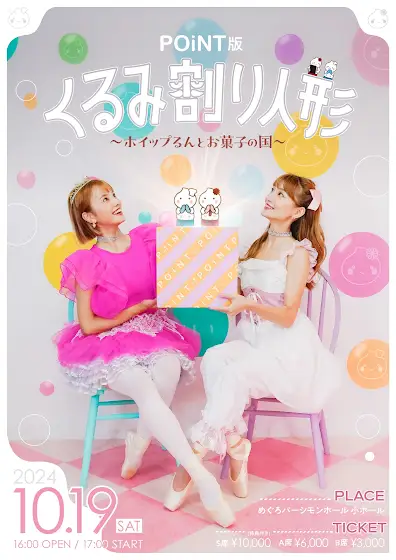 POiNT版くるみ割り人形〜ホイップるんとお菓子の国〜2024年10月19日 (土)開場 16:00 開演 17:00■場所:めぐろパーシモンホール 小ホール■チケット:t.livepocket.jp/e/7tvr1S席チケット : 10,000円(特典付き)A席チケット:6,000円B席チケット : 3,000円S席特典徐々に解禁していきます☺️🩷盛りだくさんだよ〜🌻-------------POiNT初の単独ホール公演!!チラシが完成しました!!🩰✨✨このチラシのようなキラキラした最高のステージにしますので、ぜひたくさんの方にお越しいただきたいです!!🥹✨✨絶対楽しいです!!お待ちしてます🥰🩷
