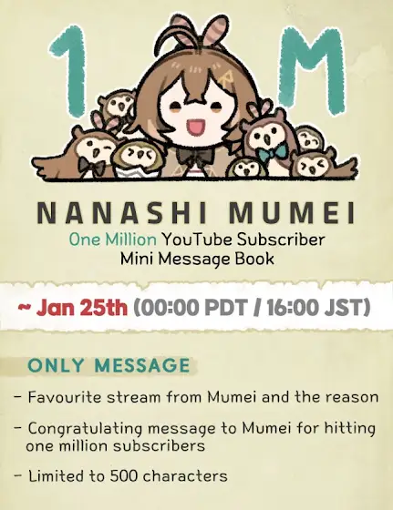 To celebrate Mumei's 1 million subscribers, hoomans plan to create a mini book with messages for Mumei!