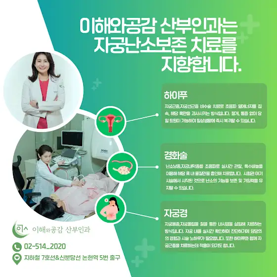 자궁과 난소는 임신, 출산 뿐만 아니라 여성호르몬, 생리 등 여성 건강 전반에 걸쳐 중요한 장기입니다.자궁혹, 난소혹 등 혹이 있다고 해서 자궁과 난소를 제거하거나 혹은 방치하기보다는적극적인 대응으로 정확한 진단과 비수술 치료를 통해 나의 건강을 지키세요.이해와공감산부인과는 자궁난소비수술 하이푸, 경화술, 자궁경을 시행합니다.여성의 몸을 이해하고아픔에 공감하는 마음으로이해와공감 산부인과 의료진은 최선을 다해 세심히 진료합니다.🏥 지하철 7호선 & 신분당선 논현역 5번 출구 앞☎️ 전화: 02.514.2020🌺 예약: 카카오플러스 친구, 네이버플레이스에서 👉‘이해와공감 산부인과’를 검색해 주세요~