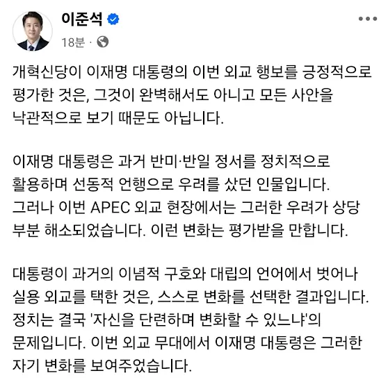 개혁신당이 이재명 대통령의 이번 외교 행보를 긍정적으로 평가한 것은, 그것이 완벽해서도 아니고 모든 사안을 낙관적으로 보기 때문도 아닙니다.