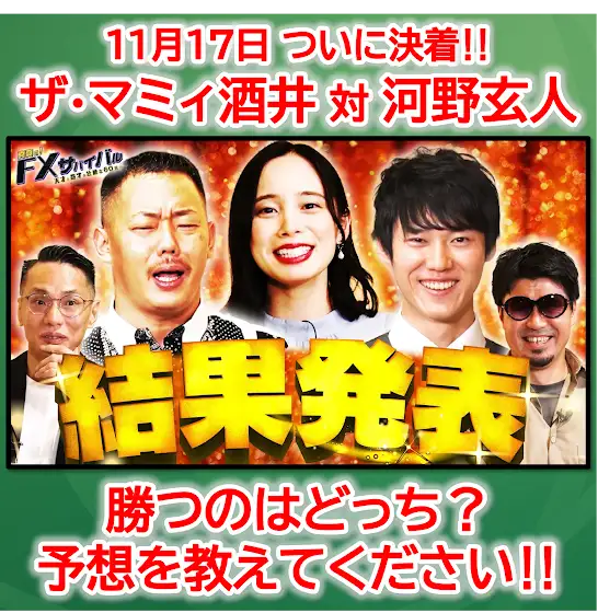 【11月17日(月)18:30公開‼】 松井証券「FXサバイバル」ついに決着の時‼ 勝つのは❝天才❞ #河野玄斗 か⁉ それとも❝奇才❞ #ザ・マミィ #酒井貴士 か⁉ 皆さんの予想を教えてください! 今までの #FX ガチバトルを一気見! 第1話👉https://youtu.be/HQqVBVYE4II 第2話👉https://youtu.be/cfv5UKxqVuo 第3話👉https://youtu.be/14zuh__LMSw 第4話👉https://youtu.be/TElClWwTpNg