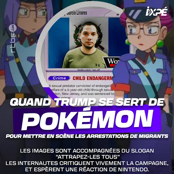 On y voit des migrants arrêtés par l’ICE, présentés comme des cartes à collectionner, sur fond de musique Pokémon et du slogan culte “attrapez-les tous”.