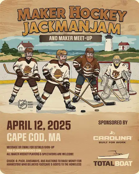 2nd annual Maker Hockey game is happening on April 12th!! Open to all makers who are also hockey players, and spectators/fans too. Comment or email me if you’re interested and I’ll send you the details and sign up form. Free to attend thanks to the generosity of Carolina Shoe and TotalBoat.