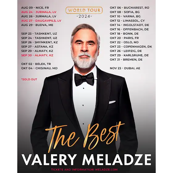 Обновленный гастрольный график Валерия Меладзе на 2024 год. Список постоянно дополняется.