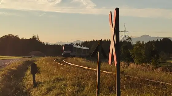 Am frühen Morgen des 28.09.2023 fährt ein LINT 51 als RB 67 der BRB nach Schongau seinem nächsten Halt in Hohenpeißenberg entgegen und passiert in wenigen Sekunden einen unbeschrankten Bahnübergang unmittelbar vor dem HP