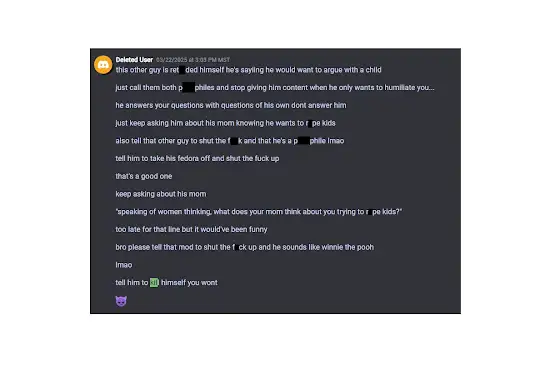 Context: The "Deleted User" shown in this screenshot is Urghbla on his main discord account that has since been permanently banned for multiple violations of discord's child safety policy in which Urghbla has made some incredibly strange comments involving children being in s*xual scenarios with adults. He's not a predator catcher, he's a weirdo that fantasizing about children and wants them to be victimized for his own profit and gain. He's also a cyberstalker, a harasser, and manipulates whoever is dumb enough to fall for it into harassing people on his behalf.