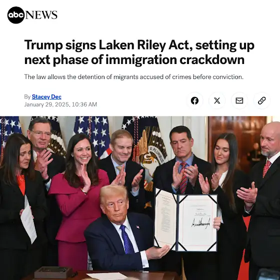 Trump just signed the Laken Riley Act today. This requires the Department of Homeland security to detain any non-citizens who are caught or charged with theft, even if it's a misdemeanor.