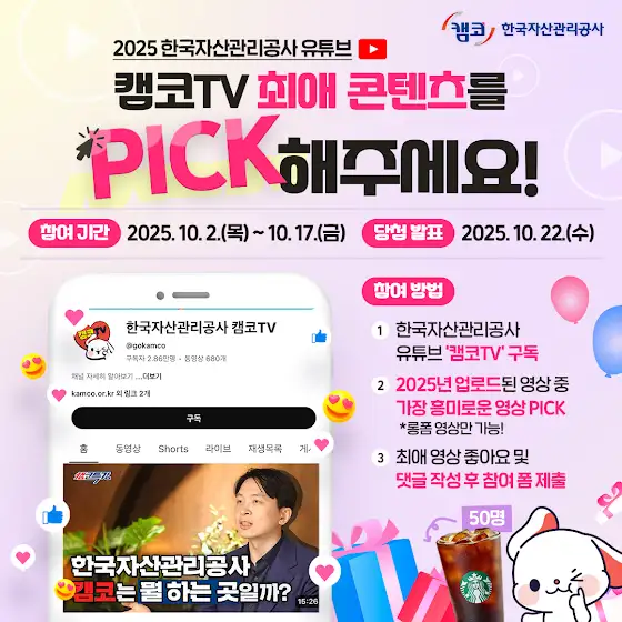 2025 한국자산관리공사 유튜브 최애 콘텐츠 PICK 이벤트❤ 📌 참여 방법 ① 한국자산관리공사 유튜브 구독하기 ② 2025년 업로드된 롱폼 영상 중 가장 흥미로운 영상 PICK ③ 최애 영상 좋아요 및 댓글 작성 후 아래 폼 제출 forms.gle/dE8mniqhNEyLNN9J8 📌 참여 기간 2025. 10. 2.(목) ~ 10. 17.(금) ⠀ 📌 당첨 발표 2025. 10. 22.(수) *개별 발표 ⠀ 📌당첨 발표 스타벅스 아이스 아메리카노 T (총 50명)