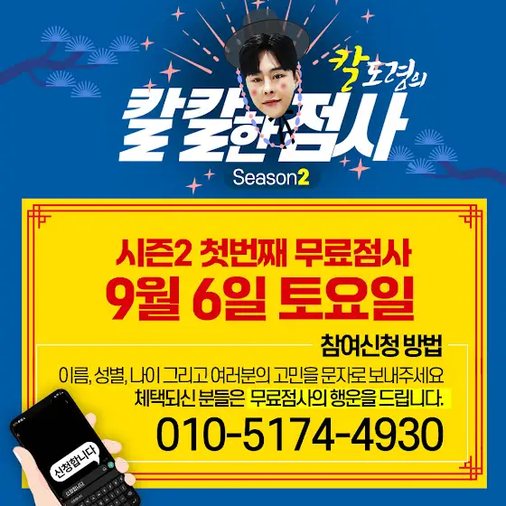 칼도령의 칼칼한점사 시즌2 첫번째 무료점사가 9월 6일 토요일 진행됩니다. 여러분들의 많은 참여 바랍니다.