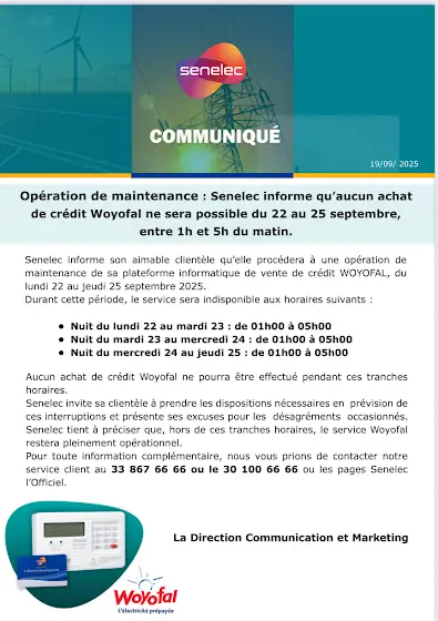 La Senelec informe son aimable clientèle qu'elle procédera à une opération de maintenance de sa plateforme informatique de vente de crédit WOYOFAL,