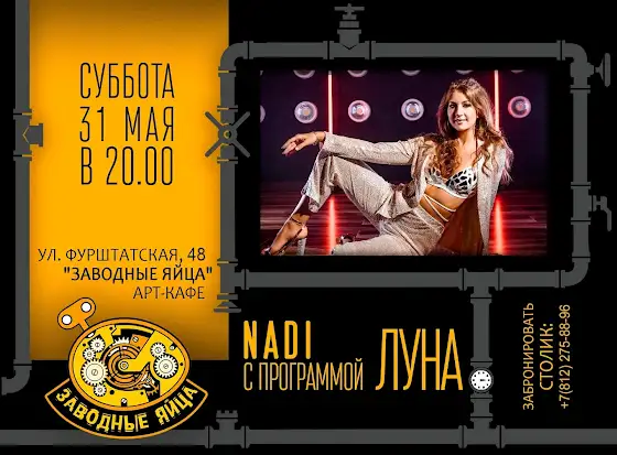 Живой концерт певицы NADI в Санкт-Петербурге 31.05.2025 с 20:00-22:00 в арт-кафе Заводные яйца. Вход свободный. Приходите.