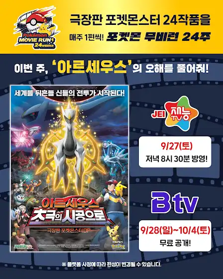 🎬포켓몬 무비런 24주🎬 매주 한 편씩 공개되는 포켓몬 무비런🎊 "초극하라! 시공의 운명이여!" 이번 주에는 미케나 마을에서의 이야기, <아르세우스 초극의 시공으로>가 방영됩니다💥 다모스와 아르세우스, 그리고 후대의 시나와 케빈, 지우와 친구들까지! 포켓몬 무비런에서 함께해요🤗 📢 방영 정보 재능TV : 9월 27일 (토) 저녁 8시 30분 방영 SKBtv : 9월 28일 (일) ~ 10월 4일 (토) 무료 공개 #Pokemon #포켓몬 #포켓몬스터 #포켓몬무비런 #극장판포켓몬스터 #포켓몬영화