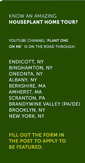 We're looking for new Houseplant Home Tours to be featured on 'Plant One On Me.' Do you have an interesting, unique houseplant collection in an awe-inspiring or relatable style? Over the next two months, we'll be traveling through: - Endicott, NY - Binghamton, NY - Albany, NY - Berkshire, MA - Amherst, MA - Scranton, PA - Brandywine Valley (PA/DE) - Brooklyn, NY - New York, NY If you're interested in letting us film your Houseplant collection for a Houseplant Home Tour, fill out the form here: bit.ly/3GrzdLq