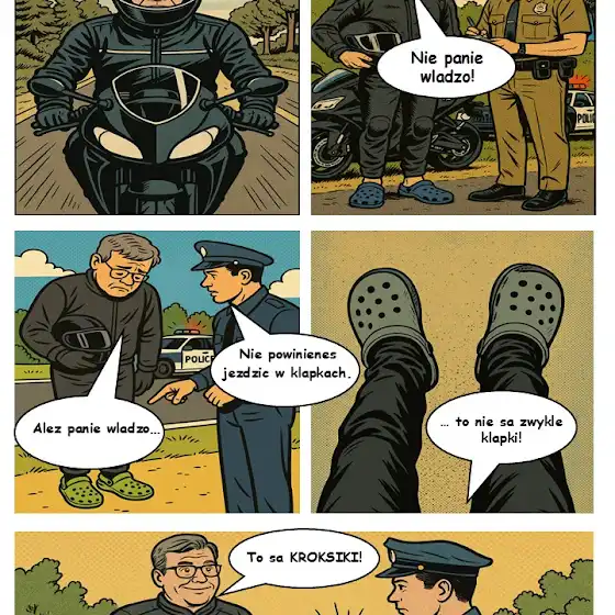 Jerzy! Jeśli już chcesz mnie grać, to błagam — pełne buty na motocyklu. Crocsy są świetne, ale nie wtedy, gdy masz 160 km/h pod tyłkiem. I druga lekcja — zobowiązania się spłaca.