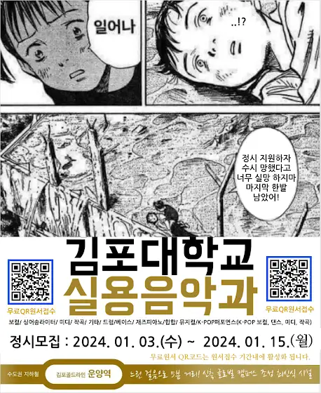 2024 김포대 실용음악과 정시모집 안내✌️🫡김포대 정시 무료원서접수 안내🤗🤗[김포대 실용음악과 2024 정시모집]무료원서접수 안내 -> “큐알코드 활용” 2024.01. 03(수) ~ 2024.01. 15(월)(정시 접수기간 안에 접수가능)-모집전공 : 보컬. 미디. 작곡. 싱어송. 기타. 드럼. 베이스. 재즈피아노. 랩. 힙합. K팝(보컬. 미디/작곡. 댄스).-신입생 특전 1. 신입생 전원 고사양 노트북 증정(100만원 상당) 2. 100만원 장학금 (수시 /정시 최초합격자) 3. 신축 기숙사 신입생 우선제공 (320실).👐수시2차 원서접수👐2024.01. 03(수) ~ 2024.01. 15(월)온라인 원서접수 : “유웨이” “진학사”👐실기고사👐2024.01. 16(화) ~ 2024.01. 18(목)👐홈페이지 참조👐ukp.ac.kr/admissions김포대학교 글로벌캠퍼스(운양역)주소 : 경기 김포시 운양동 1329-9...#김포대학교 #김포대학교실용음악과 #김포대실용음악과 #인천대중예술고 #서울예대실용음악과 #동아방송대실용음악과 #백석예대실용음악과 #서경대실용음악과 #장안대실용음악과 #동서울대실용음악과 #실용음악과수시 #실용음악과정시 #실용음악과입시 #실용음악과보컬 #실용음악과작곡 #싱어송라이터입시 #실용음악과기타 #실용음악과드럼 #실용음악과베이스 #실용음악과미디 #실용음악과보컬 #드러머 #드럼입시 #실용음악과정시 #싱송라