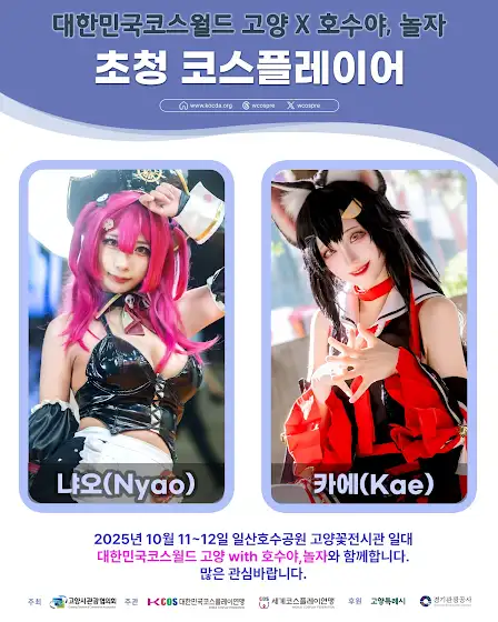2025년 10월 11일부터 12일까지 일산호수공원 고양꽃전시관에서 열리는 세계 꽃문화관광축제 '호수야, 놀자' 와 함께하는 코스프레이벤트 프로그램 '대한민국코스월드 고양' 이 추가 이벤트 정보를 추가로 발표하였습니다.