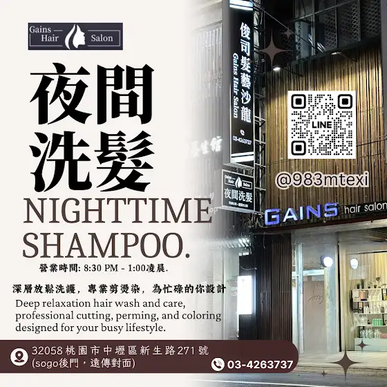 ✨ GAINS HAIR SALON|中壢夜間洗髮專業服務 ✨在忙碌的生活中,你多久沒有給自己一刻真正的放鬆與寵愛?一天結束,夜晚時光屬於你。從晚上8:30到凌晨1:00,我們的【夜間洗髮服務】為你打造專業深層舒壓洗髮與頂級剪燙染護的極致體驗。用心為你打造完美細節。🌙 深層放鬆洗護,舒緩一整天的疲憊🌙 專業剪燙染,展現自信魅力新風采🌙 夜晚專屬時光,讓你美麗不打烊________________💇♀️ 採線上預約制,建議提早預約▸ LINE預約: @983mtexi(請記得加@) lin.ee/aRJLUsB▸ 電話預約: 03-4263737________________📍 地點: 桃園市中壢區新生路271號 (sogo後門,遠傳對面)⏰ 營業時間: 晚上8:30 - 凌晨1:00 (最晚收客12:30 )________________給忙碌的自己一個溫柔的犒賞,GAINS HAIR SALON,陪你在夜晚綻放光彩。#中壢夜間洗髮 #深層放鬆 #專業剪燙染 #夜間美髮服務#忙碌生活的美麗選擇 #GAINSHAIRSALON #桃園美髮#寧靜時光 #髮型設計 #剪髮 #燙髮 #染髮 #護髮