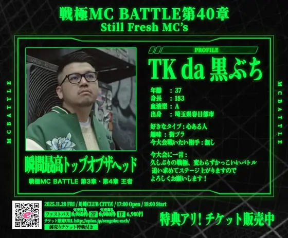 11月28日戦極MCBATTLE第40章 Still Fresh MCsチケット販売中残りは一般チケットのみ各MCのプロフィールを公開【TKda黒ぶち】チケットeplus.jp/sengoku-mcb/※全てのチケットにはこの日しか貰えない特別特典が付きますお早めに!