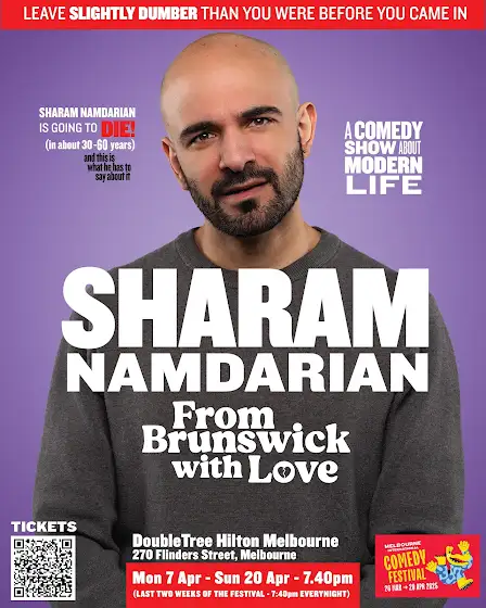 Sharam Namdarian is going to DIE soon (in 30 or so years).Part of the 𝗠𝗲𝗹𝗯𝗼𝘂𝗿𝗻𝗲 𝗜𝗻𝘁𝗲𝗿𝗻𝗮𝘁𝗶𝗼𝗻𝗮𝗹 𝗖𝗼𝗺𝗲𝗱𝘆 𝗙𝗲𝘀𝘁𝗶𝘃𝗮𝗹 𝟮𝟬𝟮𝟱, this show captures the raw dumb essence of comedy from Sharam Namdarian.An EXTREMELY local take on Australian life, death and everything in between.𝗦𝗵𝗼𝘄 𝗱𝗲𝘁𝗮𝗶𝗹𝘀:📅 𝗗𝗮𝘁𝗲𝘀: April 7th - April 20th🕢 𝗦𝘁𝗮𝗿𝘁𝘀: 7:40pm Each Night📍 𝗟𝗼𝗰𝗮𝘁𝗶𝗼𝗻: Double Tree Hilton Melbourne - 270 Flinders Street, Melbourne🎟️𝗟𝗶𝗺𝗶𝘁𝗲𝗱 𝗧𝗶𝗰𝗸𝗲𝘁𝘀 > www.comedyfestival.com.au/browse-shows/from-brunsw…Get your tickets now!