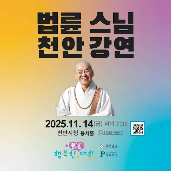 2025 법륜스님 천안강연 따뜻한 통찰과 명쾌한 해답으로 지친마음을 치유해주는 힐링멘토 법륜스님의 행복한 대화 ‘새로운 천안, 행복한 시민’의 도시 천안으로 찾아갑니다. 멋진 시민과 함께하는 법륜스님 천안강연! ⏰ 2025.11.14(금) 오후 7시 30분, ○천안시청 봉서홀 ✅유튜브 LIVE youtube.com/live/XYVJv7NJ5q4?feature=share
